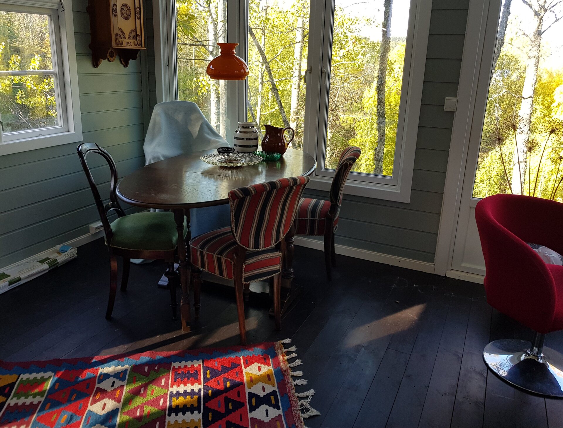 . Huset ligger i en «dejlig have», og atelieret der består av en liten skjev havestue, der lyset faller mildt og klart, slik det ofte gjør i Nordjylland, når regnet da ikke står ned eller blesten river blader og greiner av trærne. Av og til går det da også en rute i det gamle veksthuset, som dog mest brukes til ved. Ugresset der lever sitt eget liv.